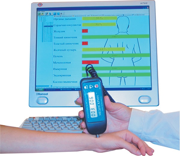 Компьютерная диагностика функционального состояния организма «Медискрин»На протяжении ряда лет коллектив специалистов (врачи, программисты, инженеры-электронщики) занимались разработкой проблемы оценки функционального состояния организма по рефлекторным зонам. Накоплен значительный банк данных, насчитывающий более сотен тысяч медицинских карт, на основании которых создано несколько поколений автоматизированного рефлексодиагностического комплекса Медискрин.